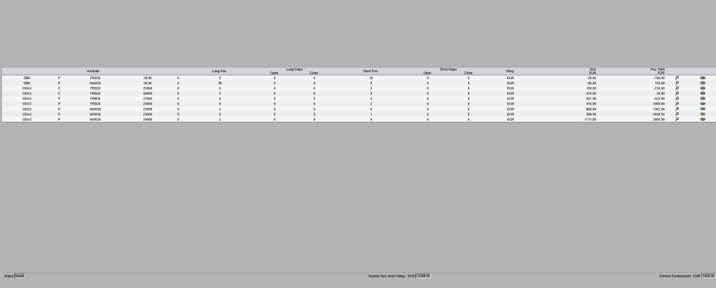 Beide Diagonal -Positionen wurden zum Teil gerollt. Wobei ich jeweils anders handelte. Bei Feb 24050 / Mar 23150 liquidierte ich die Longposition mit Gewinn und eröffnete eine halbe Position im März bei 24000. das Ziel ist, möglichst mehr Zeitwert im Februar offen zu lassen.