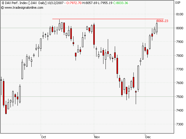 Mein Jahersziel scheint in greibare Nähe gerückt zu sein. Ich tippte in einem der früheren Beiträge auf 8056 als Kursziel für den DAX. Nun dürften wir in den kommenden Tagen diese Marke überschritten haben. Die Frage ist nur – wie lange diese Story noch andauert. Gründe gibt es kaum, außer der Hoffnung auf die ev. morgige Zinssenkung in den USA. Die Hoffnung stirbt zuletzt. Aber Spaß beiseite. Es gibt keine Anzeichen für eine größere Korrektur, würde ein „Analyst“ sagen. Da ich aber keiner bin, erlaube ich mir die Bahauptung, es hat noch nie klare Anzeichen für eine Korrektur in der Geschichte gegeben. Rückgänge kommen unerwartet und verlaufen sehr schnell.
