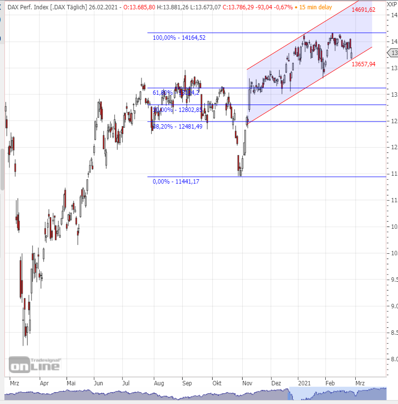 Keine Veränderung. Der DAX tut sich zwar etwa schwer, das neues Hoch zu erobern, aber er befindet sich immer noch im Aufwärtsband. Von den Fibonacci-Korrekuren ist er auch um einiges entfernt. Die realisierte Volatilität ist kaum gestiegen, die implizite ebenfalls.