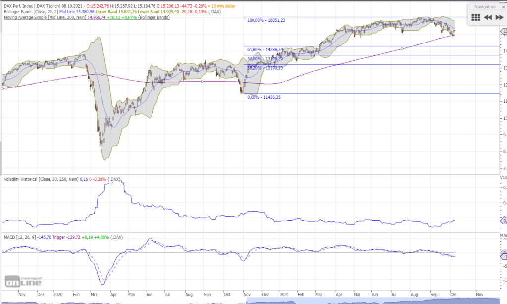Und wie immer stellt sich die Frage, wann. Der DAX befindet sich zurzeit eindeutig im Abwärtstrend, der sich durch immer kleinere Tiefs und Hochs auszeichnet. Die Indikatoren wie der MACD und 200-Tage Linie sprechen auch nicht gerade für einen Aufwärtstrend.