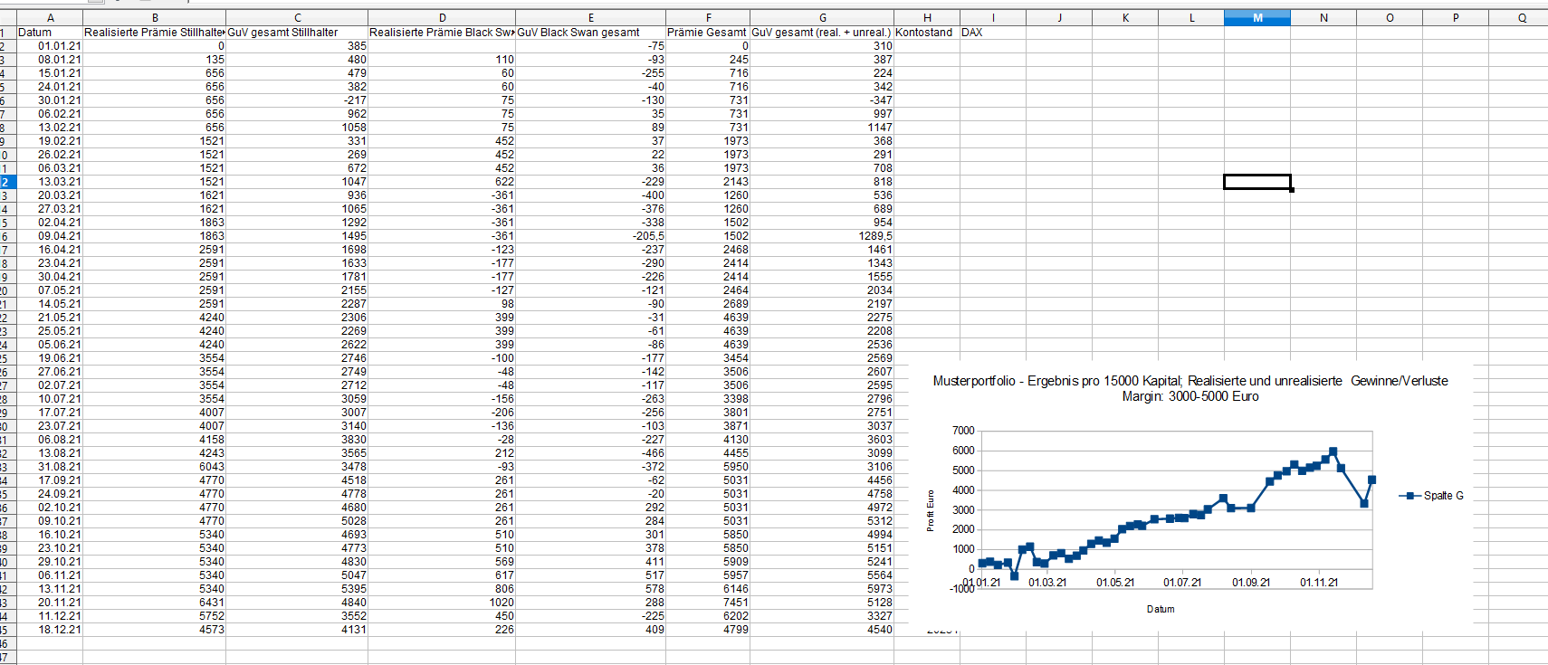 Ich habe deshalb regelmäßig über die Zusammensetzung des Portfolios berichtet, In den ersten 10 Monaten waren es sogar detaillierte Transaktionsprotokolle. Irgendwann gab ich es auf,. So transparent musste ich auch nicht sein. Die Feedbacks waren spärlich und so blieb es bei einem Update nach einem Verfall. Die Nachvollziehbarkeit der Trades ist natürlich nicht mehr vollkommen, dafür aber stimmt die Gewinn-Verlust Kurve allemal und war stets aktuell.