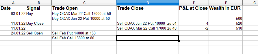 VRP Sell Open Verfasst vonOption_BasilJanuar 26, 2022Veröffentlicht inDepot Etwas verspätet aber am Montag war ich mir nicht ganz sicher. Spätestens am Dienstag, sagt mein System, verkauft man die Implizite Volatilität. Unten das Trading Journal des Testsystems und ein Einblick in das Backtest – Protokoll. Teilen Sie dies mit: Klick, um auf Facebook zu teilen (Wird in neuem Fenster geöffnet) Facebook Klicke, um auf X zu teilen (Wird in neuem Fenster geöffnet) X Gefällt mir Wird geladen … Ähnliche Beiträge Veröffentlicht von Option_Basil Investieren Mehr Beiträge anzeigen