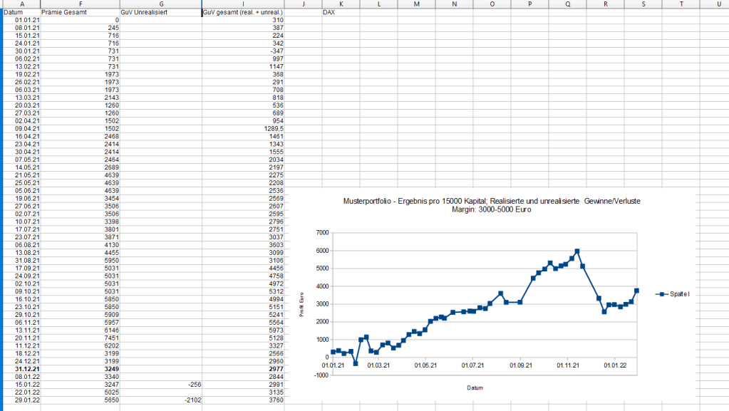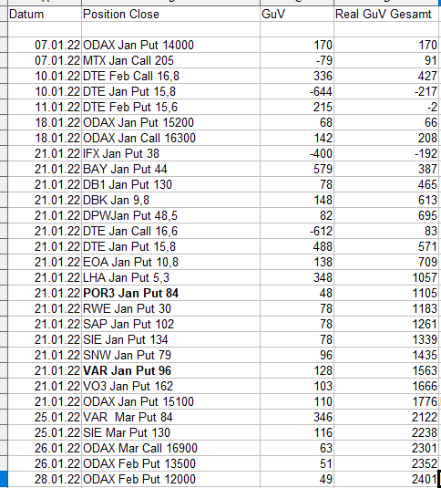 Mein Musterdepot hat sich sehr gut seit 1.01 entwickelt. Ich hätte zumindest fast 900 Euro mehr auf dem Konto, wenn ich am Freitag alle Positionen geschlossen hätte. Ich bleibe meinem Regelwerk treu und halte das Risiko sehr begrenzt. Unten die vorläufige GuV Kurve und ein Auszug aus dem Tradingjournal.
