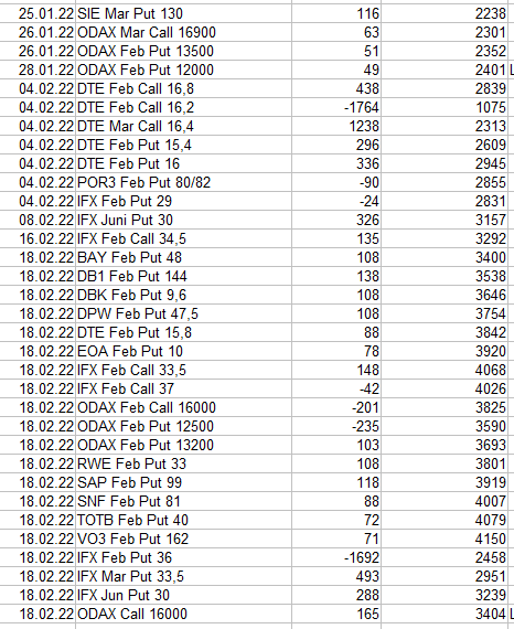 Fast alle Positionen im Februar waren wertlos verfallen. Eine Ausnahme war IFX ( Infineon). Hier habe ich durch diverse Hedge-Maßnahmen den Verlust aus der Put-Shortposition deutlich reduziert, musste ihn am Ende doch mitnehmen. Ich entschied mich dennoch gegen eine Andienung mit Aktien, da ich inzwischen nicht mehr so sehr von diesem Titel überzeugt bin.
