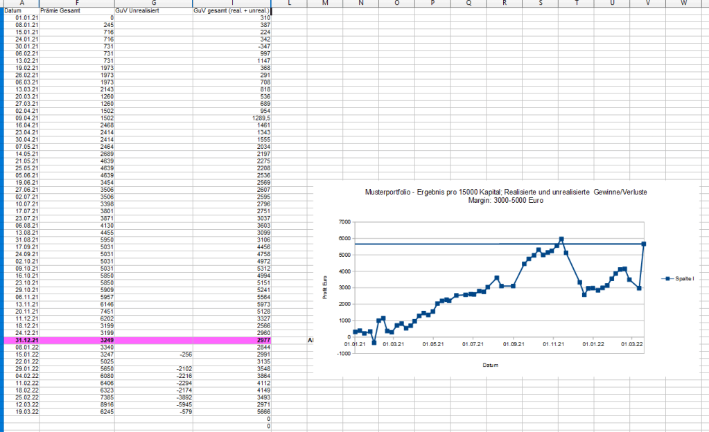 Es war eine sehr aktive Zeit im Musterdepot. Ich habe so gut wie keine Stillhalterposition glatt gestellt bez. gerollt. Die im Geld liegenden Put-Shortpositionen haben ich mit Kombinationen und zum Teil mit verkauften Calls abgesichert. Darüber hinaus standen die Black Swan Positionen in gekauften Puts und Calls im Fokus. Dort habe ich öfter Umschichtungen vorgenommen. Am Ende lässt sich das Ergebnis sehen,.Unten ein kleiner Ausschnitt des Trading Journals und des GuV. Das Gesamtergebnis – Summe des realisierten und nicht realisierten GuV ist das besten in diesem Jahr. Nativ zu bewerten ist mein Verfahren mit den offenen Calls. auf der Shortseite. Das wusste ich eigentlich schon vorher. Ich werde nie schlauer…