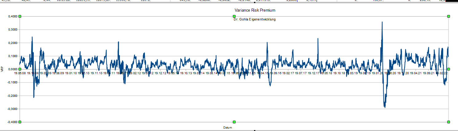 Zweitens macht mich mein eigens entwickelter Indikator unruhig. Es handelt sich um das Varianz Risk Premium. Hier wird grob gesagt die Abweichung der beobachteten und der impliziten Volatilität berechnet.