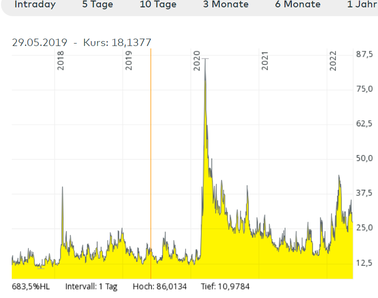 spüren.Mit der wohl bekannten Unnachgiebigkeit wird gekauft, sobald die Aktienpreise etwas nachgegeben haben. Die großen Investoren haben sich bekanntlich längst vom Markt verabschiedet. Es sind die neuen Börsianer, die für Schwankungen sorgen. Es sind diejenigen von Euch, die an die Einstiegskurse glauben. Witzigerweise gibt ihnen ein oberflächlicher Blick auf die Charts Recht. Der DAX steht zwar 10% unter Jahresanfang aber auch 10% über den Tiefes nach dem Beginn des Ukraine-Krieges. Und er scheint seitwärts zu tendieren. Auch die implizite Volatilität gemessen an den DAX-Optionen liegt etwas auf dem Niveau vor dem Krieg.