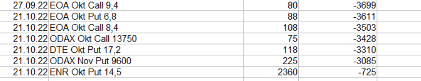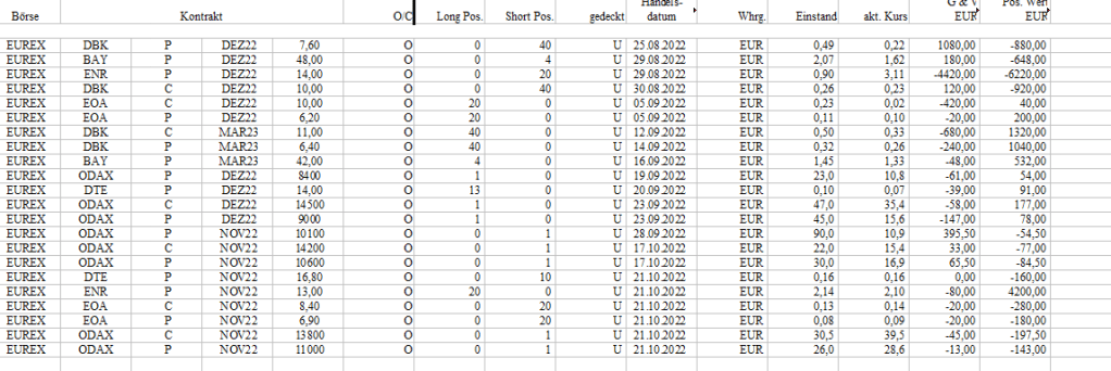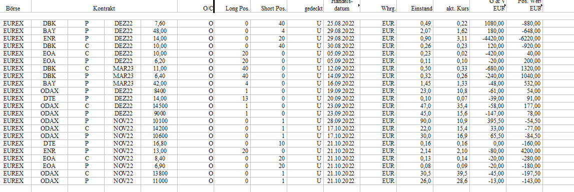 Die größte Gefahr ist ein unerwartetes Ereignis über Nacht – Atomkrieg, Hineinziehen anderer Länder in den Krieg, Militärputsch in der BRD usw. Darauf versuche ich immer mit langlaufenden Puts vorbereitet zu sein. Der der Tag X wird kommen, hoffentlich nicht morgen. Bis dahin gehen der Lieblingsbeschäftigung eines Stillhalters nach.