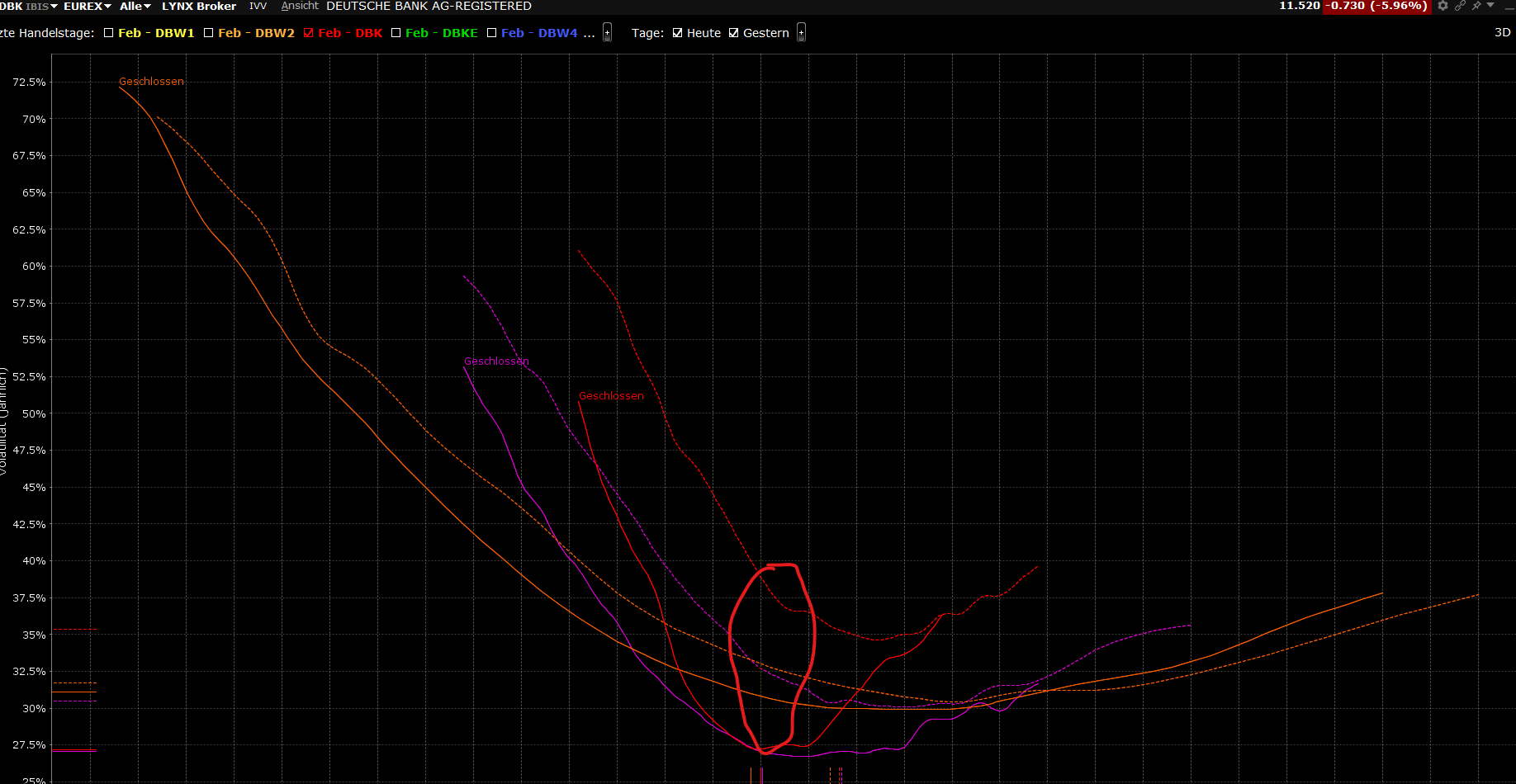 Unten sehen wir die Terminstrukturkurve der impliziten Volatilität und deren Veränderung vom 1 auf 2.Februar. Man sieht auch die Skew, den Abstand zwischen den kurzen und langen Terminen. Die Volatilität der Märzkontrakte war vorher deutlich niedriger. Am 2.02 ist diese ebenfalls etwas zurückgegangen.