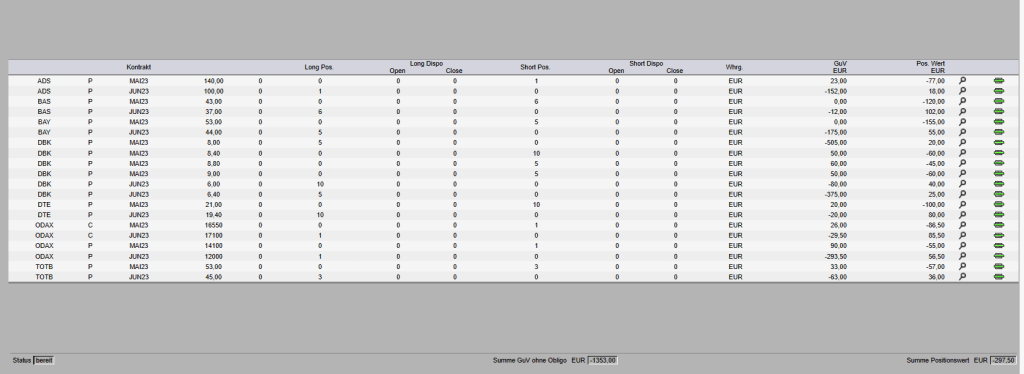 Neu in dieser Woche ist die BASF Position. Im Moment halte ich: DTE, ADS, DBK, ODAX, TOTB, BAY. Unten ein Ausschnitt. Die Positionen sind auf 3-6 Monate ausgelegt, die angezeigten GuV Zahlen sind deshalb nicht aussagekräftig.