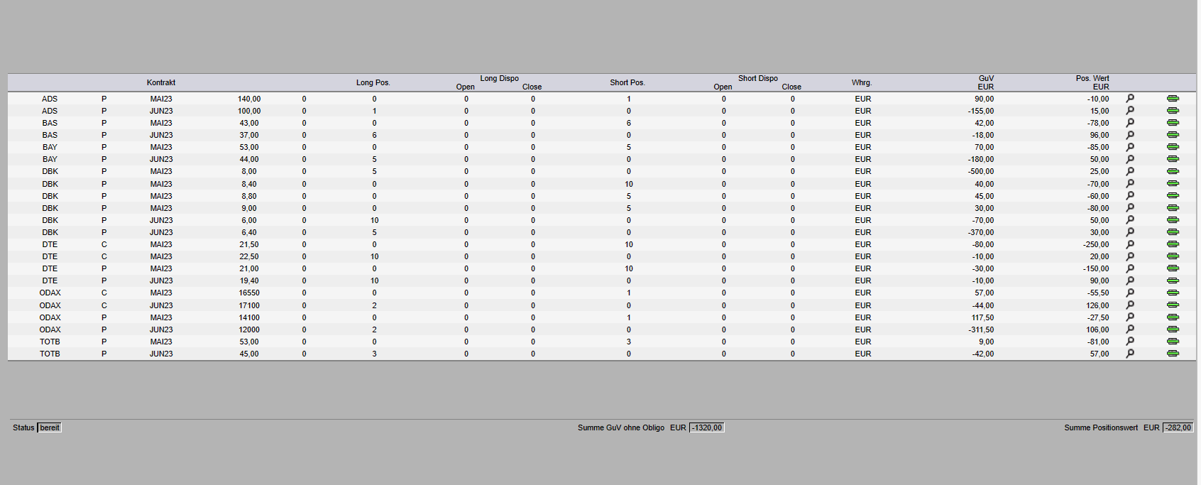 Unten ist der Auszug meines Depots vom Wochenende. Die Performance wird besser, auch weil der Verfall naht. Bei der Deutschen Telekom habe ich einen Hedge in Calls eröffnet, den werde ich aber noch vor den Zahlen am Donnerstag voraus schließen. Ich kennen zwar die Quartalszahlen und die Reaktion der Börsianer nicht, aber ich weiß, dass die Calls auf Shortseite die meistens Probleme verursachen. Die DTE Aktien ist schlicht zu gut, weshalb ich nur schwer mit einer heftigen Korrektur rechnen kann.