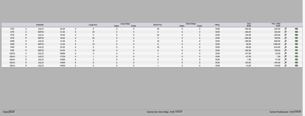 Die ODAX -Positionen entwickeln sich wie erwartet am besten. Ich halte außerdem DTE Diagonals, die eine Seitwärtsbewegung antizipieren. Darüber hinaus sind auf FRE im Depot. Eine spekulative Position ist auch darunter. In Siemens Energy eröffnete ich einen Kalender-Spread. Hier rechne ich mit dem Abbau der IV und der Backwordation. Sie war ja nach der übertriebenen Reaktion der Märkte am Freitag gestiegen. Ich muss zugeben, ich rechnete mit einem stärkeren Anstieg. Die IV Vola des Frontmonats lag bei 62% und die IV des Backmonats lag bei 50%. Generell rechne ich nicht mit der Insolvenz der Siemens Energy, deshalb dieses Geschäft
