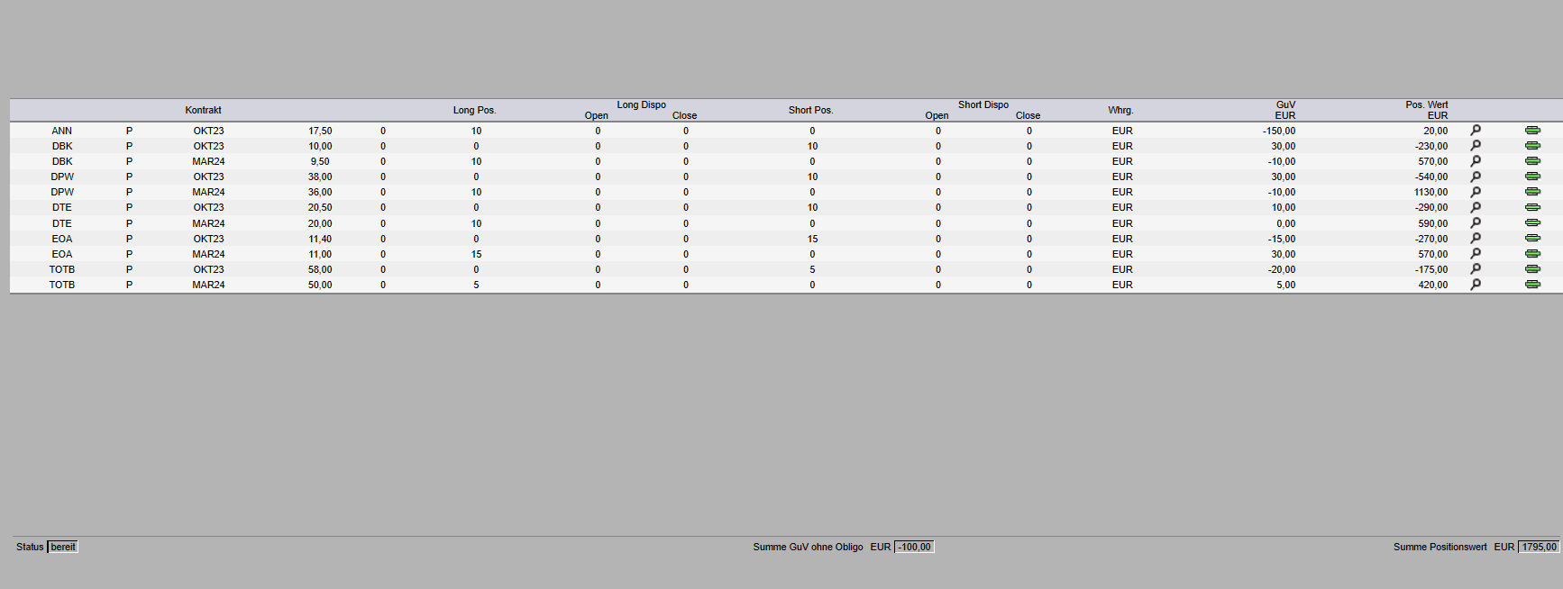 Ich versuche inzwischen die Volatilität aus dem Depot herauszunehmen. Deshalb habe ich die Anzahl der Kontrakte deutlich reduziert. Auf der Shortseite liegen Positionen, die ich notfalls in Aktien umwandeln könnte. Meine Strategie hat sich im Wesentlich nicht verändert. Nach wie vor verkaufe ich kurz laufende Puts und sichere sie mit länger laufenden Puts des gleichen Basiswerts.