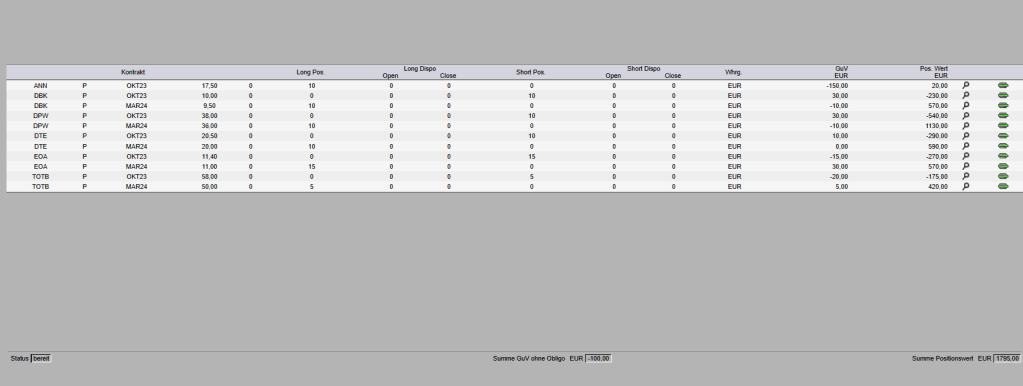 Außer der vagen Erwartung der Jahresendrally wage ich keine weitere Prognose. Solange das milde Wetter hält und keine Wende im Krieg sowie in der Zinspolitik erkennbar ist, könnte es so weiter gehen. Einfach seitwärts und leicht fallend. Es ist kein schlechter Markt für Stillhalter, aber eben mit hohen Risiken.