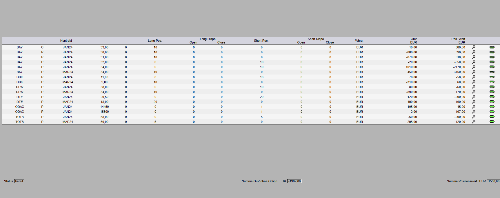 Ich habe wohl neue Positionen eröffnet. Zum einen in BAYER verkaufte ich Calls und Puts zum 32,5. Ich bin in diesem Wert bereits long positioniert in Calls und Puts etwas aus dem Geld.