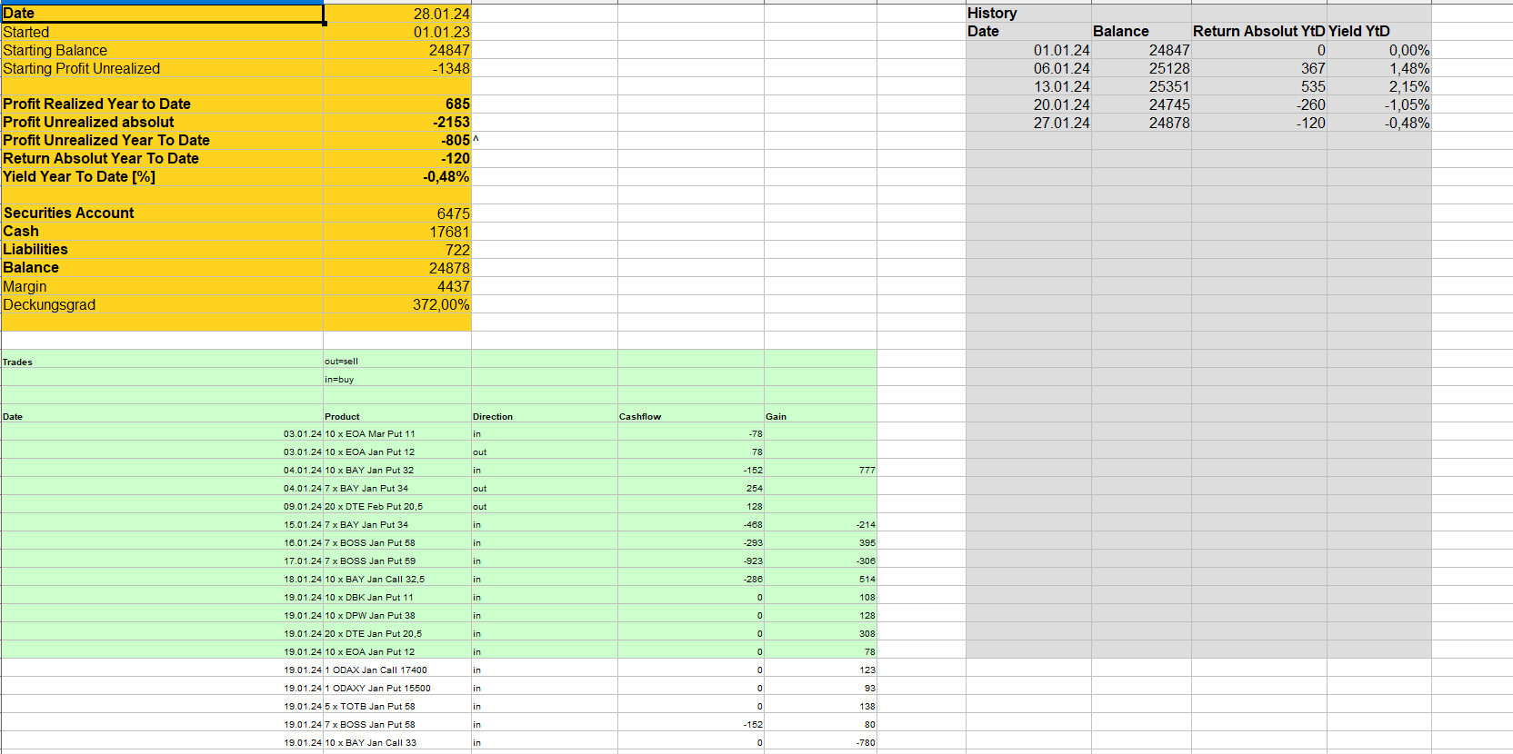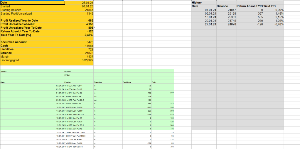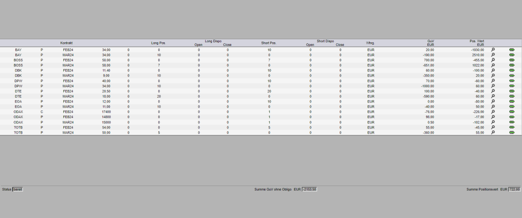 Mein Derivate -Depot hat anfangs der Jahres zugelegt, nach den ersten 10 Tagen jedoch etwas abgegeben. Es waren wieder Experimente mit Bayer, die einen Teil der Performance gekostet haben. Insgesamt betrachtet befindet sich der gesamte Ertrag etwas unter Null. Es läuft aber alles nach Plan und ich rechne deshalb mit einer deutlichen Verbesserung der Rendite in den kommenden drei Wochen, beobachte aber den Markt aufmerksam. Eine längere Bewegung nach unten würde die Bilanz etwas durchwirbeln. Die einzelnen Positionen habe ich unten aufgelistet. Die größten Brocken BOSS und BAYER habe ich eng abgesichert. Dort will ich vor allem den Zeitwert gewinnen. Bei den anderen Spreads rechne ich mit einem langsamen Anstieg des Basiswerts bzw. mit seiner Seitwärtsbewegung.