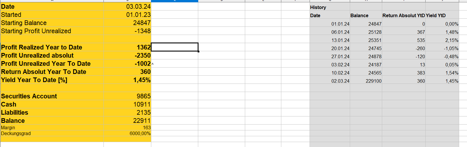 Die Performance seit Jahresanfang ist nicht berauschend, aber ich bleibe zuversichtlich, weil das Portfolio ausgewogen ist. Die Bilanzsumme ist gesunken, weil nicht alles Verluste mit den versteuerten gewinnen verrechnet worden sind.