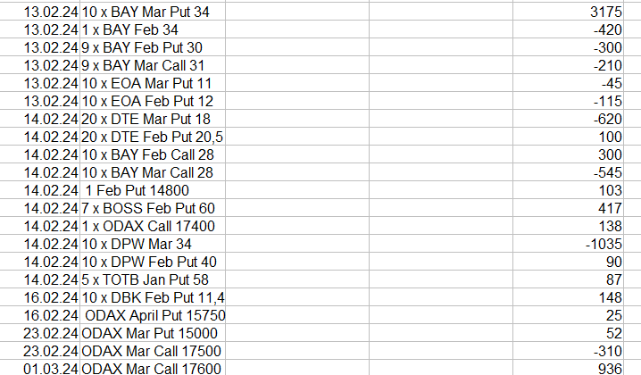 Ich war fast drei Wochen verreist. Zuvor gab es den Verfall und ich hatte deshalb fast alle Positionen geschlossen und nur wenige neu eröffnet, Am Ende ist ODAX und BOSS übrig geblieben. Von der Karibik war es recht mühsam, zu handeln. Ich habe dennoch einmal den ODAX Call auf 17550 gerollt und auch den Put auf April 16750.