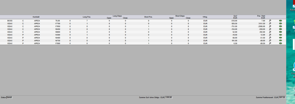 Auf der Call-Seite nähert sich der DAX dem Strike 17450 , wo ein offener Calls verkauft ist. Dieser ist aber mit zwei Calls 17800 abgesichert und mit einem Spread. Insgesamt ist meine Gewinnerwartung für den April bescheiden: zwischen 200-400 Euro netto. Das reicht mir aber aus. Dafür muss ich mich mit der Börse nicht den ganzen Tag beschäftigen.
