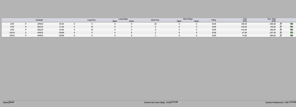 Ich habe tatsächlich wieder Calls auf den DAX verkauft. Das hat sich oft als verlustreich erwiesen, man hat eigentlich keinen echten Vorteil, beim Verkauf der Index-Calls. Ich bin aber scharf auf die Prämie! Ich muss dennoch aufpassen und werde den gesamten Condor rollen, sobald die Position in einen nennenswerten Verlust läuft.