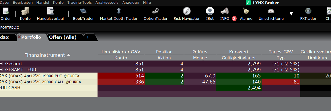 Ich habe tatsächlich wieder Calls auf den DAX verkauft. Das hat sich oft als verlustreich erwiesen, man hat eigentlich keinen echten Vorteil, beim Verkauf der Index-Calls. Ich bin aber scharf auf die Prämie! Ich muss dennoch aufpassen und werde den gesamten Condor rollen, sobald die Position in einen nennenswerten Verlust läuft.