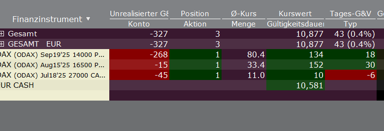 In der letzten Woche habe ich sowohl die Calls als auch die Puts herunter gerollt. Ich verkaufte August-Puts unter dem Strike der Hedge -Position . Und ich bin mit dieser Positionierung einigermaßen zufrieden. An meiner Strategie hat sich nicht viel geändert. Ich warte auf große Schwankungen und versuche die Prämie günstig zu halten.