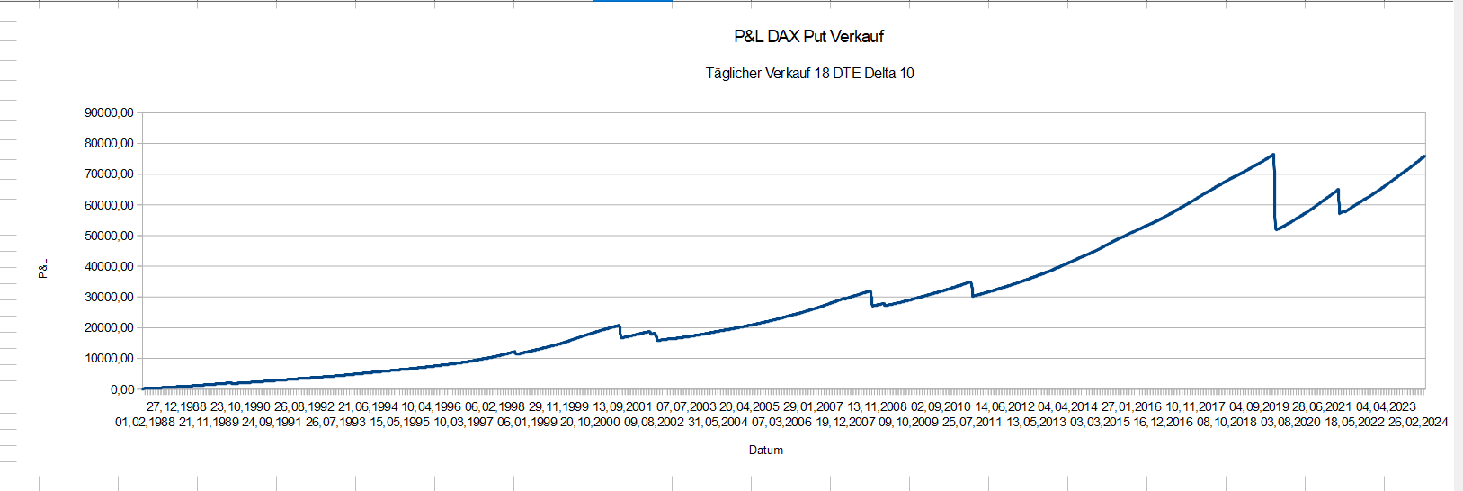 Der Verkauf von nackten Puts ist langfristig profitabel, wenn man dauernd aktiv bleibt. Man darf keine Periode auslassen. Wenn man Pech hat und zum falschen Zeitpunkt einsteigt, muss man bis zu 5 Jahren auf die schwarze Null warten.