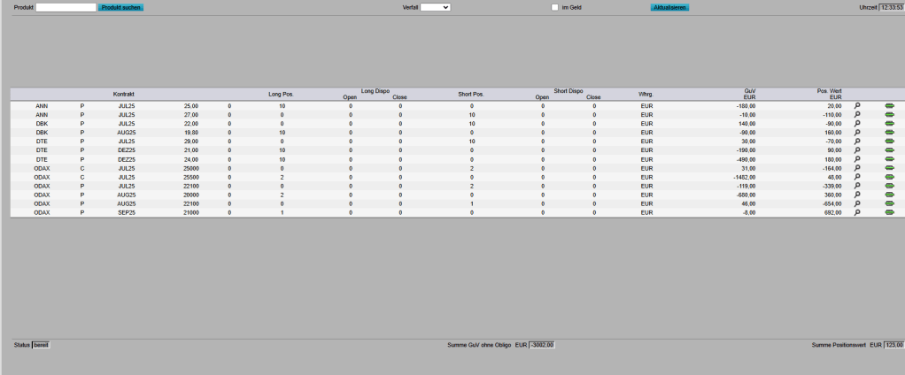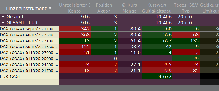 Der Index hat in der letzten Woche etwas nachgegeben und die Volatilität zog nach. Deshalb sind die Positionen leicht in den Verlust gerutscht. Meine Erwartung bleibt unverändert. Ich rechne mit einem unsicheren Umfeld bis August. Erst Anfang September sollte die große Korrektur endlich einsetzen. Meine Hoffnung ist, bis dahin startbereit zu sein. Die Position sollte dann vega-positive-Position sein. Das erfordert natürlich Arbeit und leider auch häufiges Umschichten. Der Markt schreit nach einer Korrektur nicht zuletzt wegen der Zölle und der schwächenden deutschen Wirtschaft. Einen zusätzlichen Bosster könnten auch die Kriegsängste werden. Generell kann niemand einen „Crash“ vorhersagen“. Anders als im bullischen Markt kannst Du schlecht auf die Fortsetzung der Baisse setzen. Man muss einfach völlig unkorreliert auf fallende Kurse wetten und so kalkulieren, dass man nicht zu viel Geld damit verliert.
