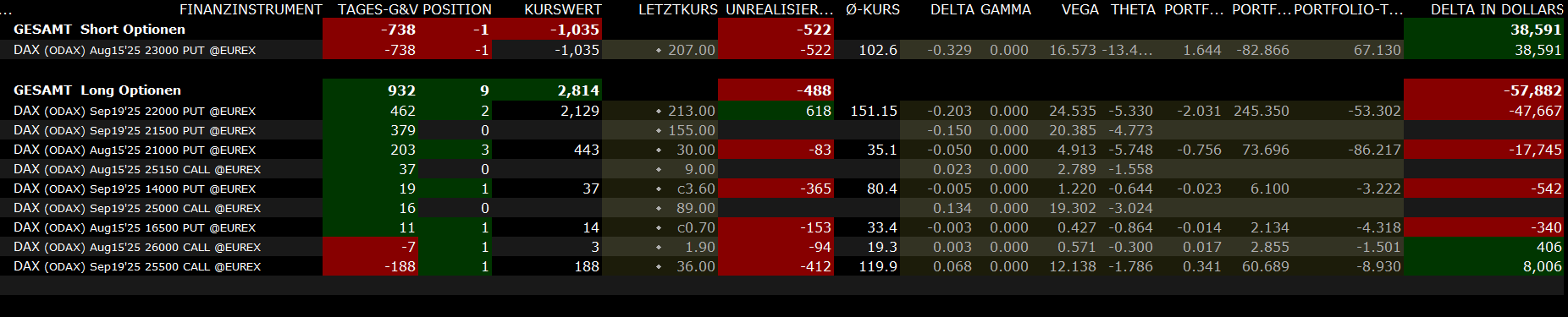 Warum tue ich das? Nach der reinen Lehre müsste man jetzt die Volatilität verkaufen. Das wäre wohl sehr lukrativ, wenn am Montag eine Beruhigung eintreten wird. Ich habe trotzdem mehr Puts gekauft. Mein Portfolio ist wie man unten sieht Delta-neutral jedoch stark vega-positiv.