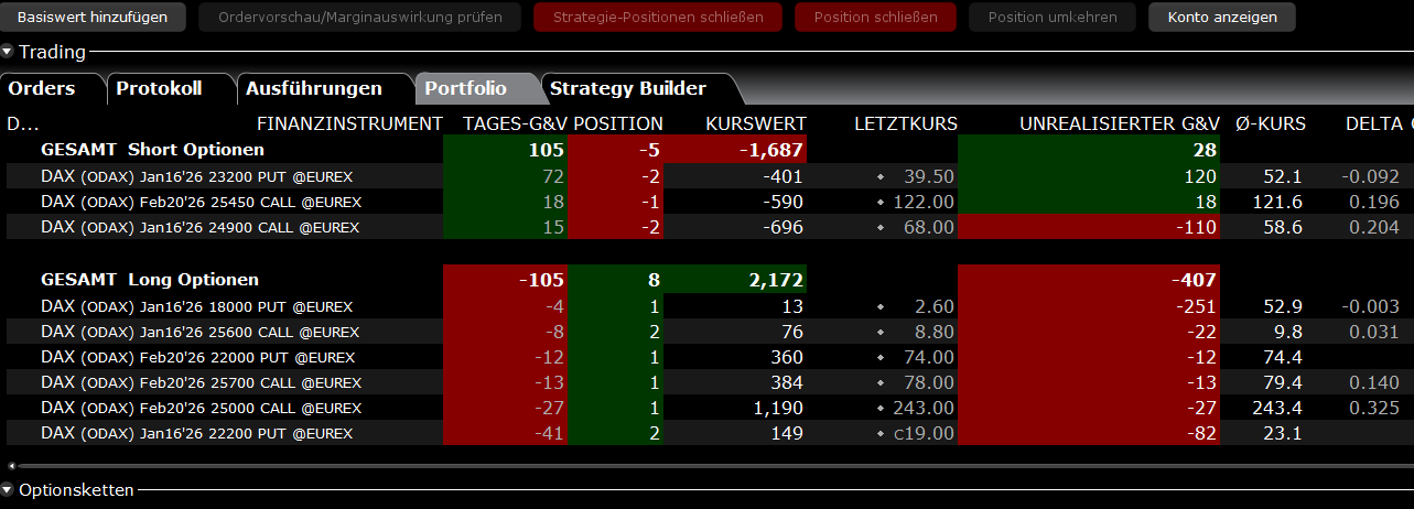 Viel ist nicht zu berichten. Ich arbeite weiterhin am Konzept für 2026. Ich beendete die Positionen und eröffnete zuerst lediglich einen Iron Condor im DAX. Dieser wurde zuerst nach unten mit kleinem Gewinn gerollt. Am 22.12 steig der DAX und ich habe einige Hedge-Positionen eröffnet. Das Portfolio ist jetzt ausgeglichen und mit einem positiven Delta. das heißt, ich werde von dem von mir erwarteten Anstieg profitieren. Die gesamte Performance hat zuerst etwas nachgegeben. Der verkaufte netto Zeitwert ist jedoch positiv, so dass ich grundsätzlich von einem Ertrag ausgehe.