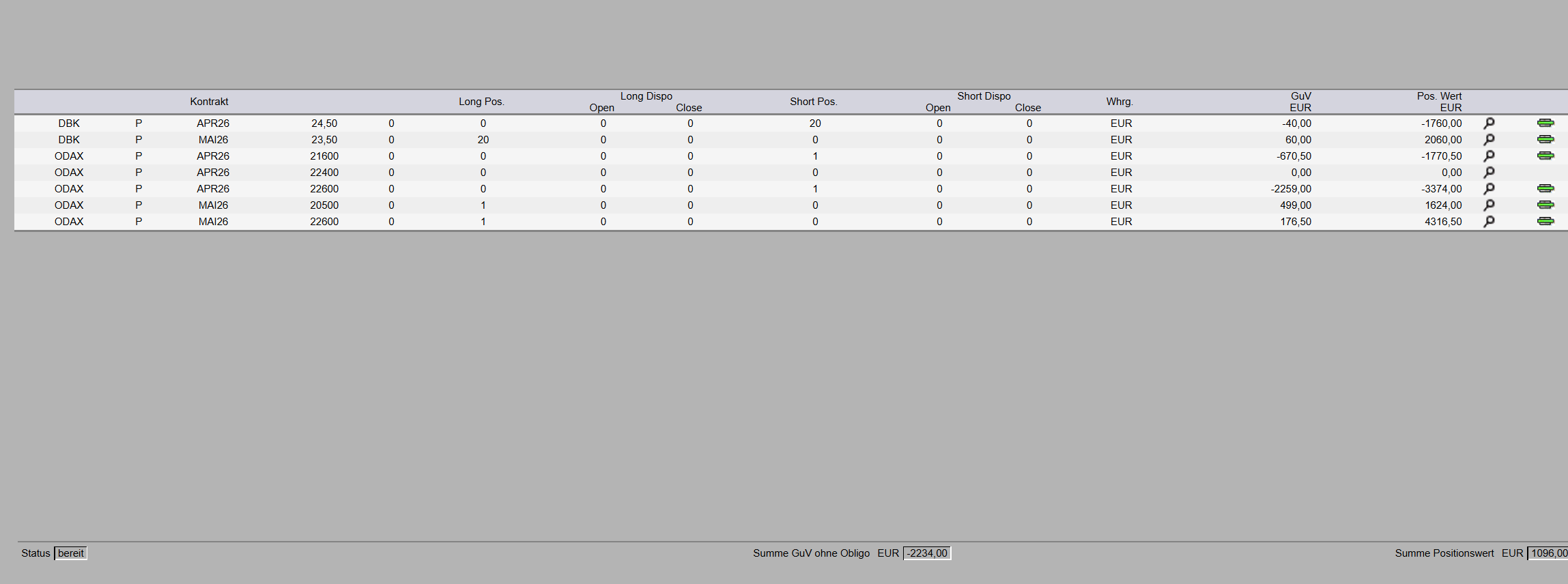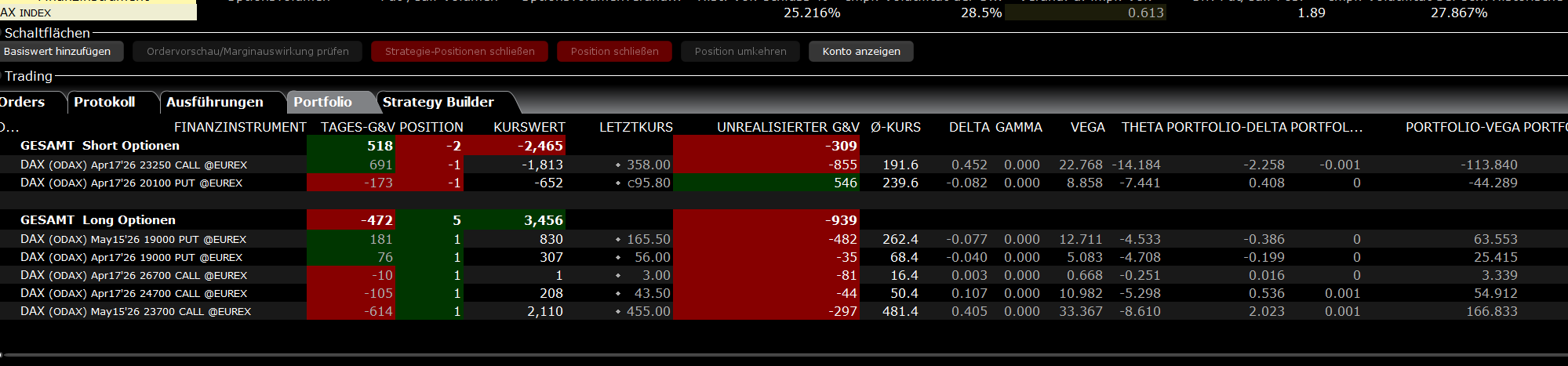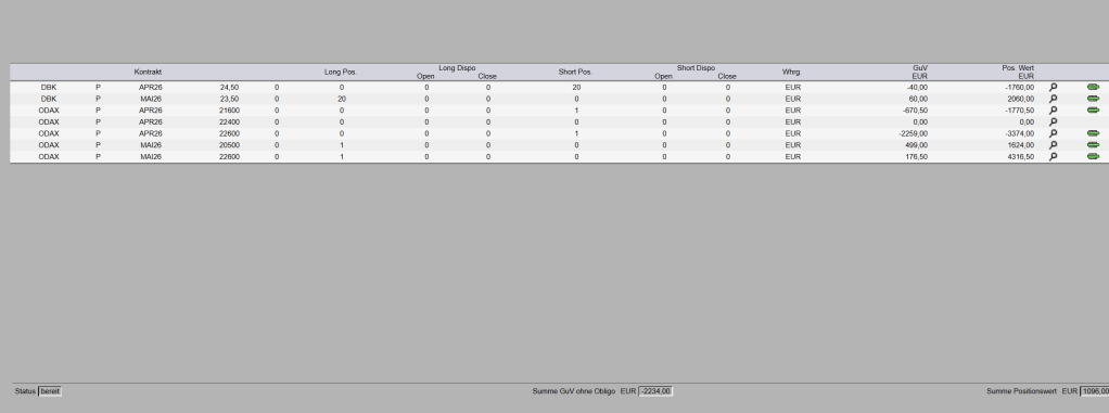 ODAX Kalender: April/Mai 23600. Diese Position ist eigentlich ein ursprünglicher Debit-Spread, aus welchem ich einen Credit-Spread machte und jetzt nachdem ich zwei Mal den Gewinn mitnahm kaufte ich schlicht den Mai 23600, um den großen Zeitwert im April auszunutzen. Auch hier hoffe ich auf einen IV Anstieg.