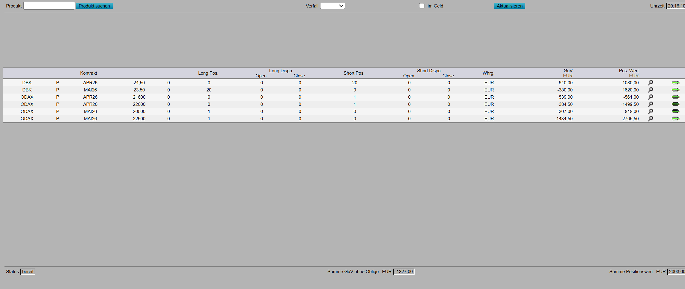 Neue Positionen in DAX werden erst bei geeigneten Preisen eröffnet. Es gab gestern ein paar Gelegenheiten, die ich leider nicht wahrnahm Heute ist es zu spät.Die nächste Chance wird kommen, wie ein Aufzug, wenn man einen verpasst hat.