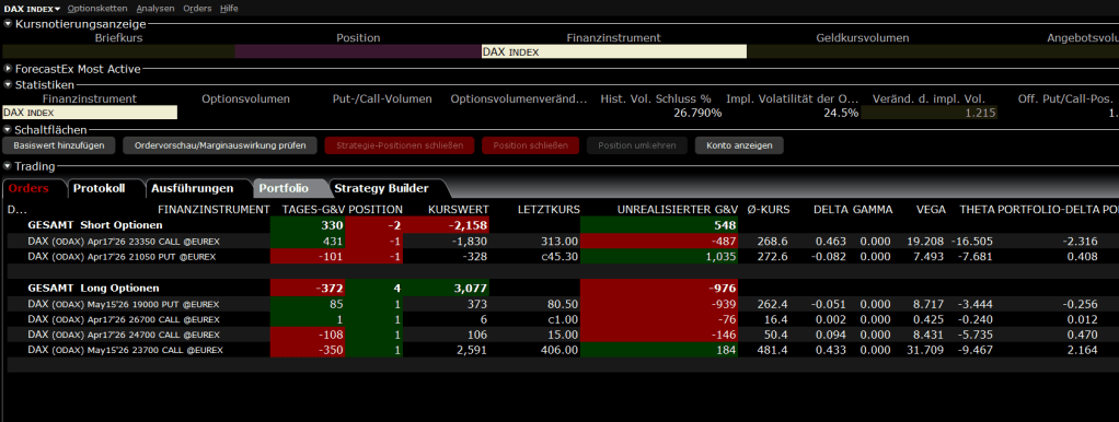 Unten sind die Screenshots meiner Depotauszüge.Die diagonal Iron-Condor – Position ist zwischen stark delta-positiv also bullisch. Ich muss sie mehr im Auge behalten. Die anderen sind eher neutral. Dort warte ich auf den Zeitwertverfall.