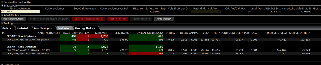 Oder du bist wie ich eher auf der Short-Seite. Tja, natürlich war ich abgesichert. Die Gegenseite legte auch stark zu. Aber gewinnreich war die Woche nicht. Inzwischen bin ich zu einer sehr einfachen Strategie mit zwei Diagonals übergegangen.