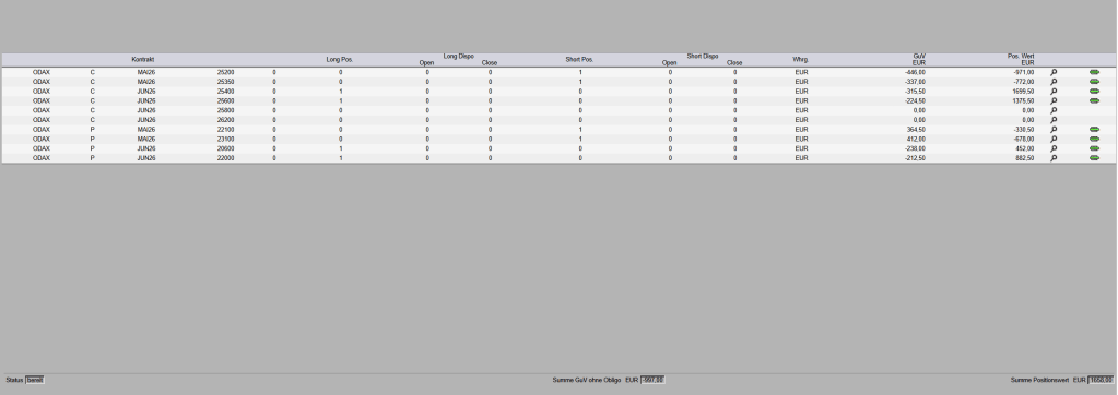 Diese Risiko ist aber nicht in den Märkten sichtbar. Die Rally will nicht aufhören und auf jede stärkere Korrektur folgt ein extremer Sprung, sobald sich der US-Präsident besser gelaunt zeigt. Das ist schon verrückt. Wir sahen es am besten am Freitagnachmittag. Die Nachricht über die Öffnung der Straße von Hormus hat den DAX gleich um 700 Punkte steigen lassen und zwar in 10 Minuten. Hier kommt jede Call-Shortposition in Bedrängnis. Ein vernünftiger Optionshändler kann nicht einfach zuschauen und hoffen, dass das nur ein Strohfeuer ist. Das gleich gilt für die Richtung abwärts.