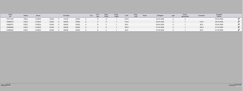 Ich habe nichts gehandelt. Meine aktuellen Positionen laufen gut. Ich hatte zwar diese Woche beide Calls heruntergerollt. Angesichts des steilen Anstiegs zum Tagesende haben die etwas verloren. Sie sind aber weit aus dem Geld und die Puts im fetten Gewinn. Ich hoffe, ich muss sie nicht mehr rollen.