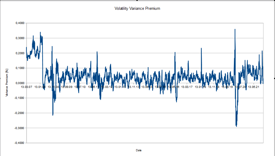 Wenn Sie Optionen kaufen oder verkaufen, dann wetten Sie auf den Abstand zwischen der historischen und impliziten Volatilität.. Diese Differenz wird auch Variance Risk Premium oder Variance Premium genannt. Unten in der Grafik habe ich die Varianzprämie seit 2007 gerechnet. Es ist deutlich z sehen, dass der Wert positiv ist und dass er schwankt. Der arithmetische Mittelwert beträgt 4%.