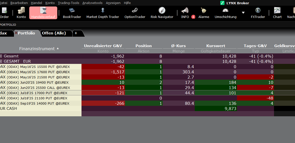 Ich stehe nach dem Mai-Verfall 190 Euro unter dem Stand vom 17.04. Das ist zwar unrealisiert, dennoch wäre vermeidbar gewesen. Der eigentliche Plan wurde erfüllt und brachte fast 1000 Gewinn. Danach folgten zwei ungeplante Ideen darunter eine überflüssige. Vor zwei Wochen habe ich plötzlich eine weitere Call-Position auf der Shortseite eröffnet. Das war nicht klug aber machbar. Ich ahnte, dass der Markt nach dem Wochenende gegen mich laufen wird. So wurde es auch. Hier kam der erste Fehler. Anstatt das einzusehen und die neue Position inklusive Hedge einfach schließen, fing ich an zu spekulieren. Es folgten weitere Trades und ihre Absicherungen Irgendwann habe ich mich doch überwunden und beendete die Geschichte. Ich verschenkte fast 500 Euro.