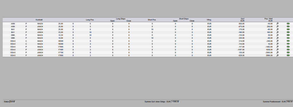 In meinem Depot sind es die 17900 Puts sehr nahe am Geld, die durch Juni Puts 17400 abgesichert sind. Da ich jedoch die ganze Zeit mit einer Korrektur rechnen muss, kaufte ich am Ende Vertikal Put-Spreads als zusätzliche Absicherung. So rechne ich bis Ende der Mai-Periode mit 1700 zusätzliche Einnahme und ca. 1000 Verlust durch Abschreibungen bei den Puts. Der erwartete Zuwachs des NAV dürfte also bei 600 liegen plus die bereits realisierten 900 Euro. Gelingt mir das, dann habe ich ein gutes Geschäft gemacht. Das setzt aber voraus, dass der Markt in den kommenden zwei Wochen ähnlich verlaufen wird wir in den letzten zwei – seitwärts und tendenziell leicht fallend. . Eine Garantie gibt es nicht.