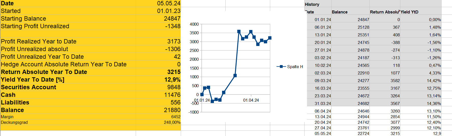 In meinem Depot sind es die 17900 Puts sehr nahe am Geld, die durch Juni Puts 17400 abgesichert sind. Da ich jedoch die ganze Zeit mit einer Korrektur rechnen muss, kaufte ich am Ende Vertikal Put-Spreads als zusätzliche Absicherung. So rechne ich bis Ende der Mai-Periode mit 1700 zusätzliche Einnahme und ca. 1000 Verlust durch Abschreibungen bei den Puts. Der erwartete Zuwachs des NAV dürfte also bei 600 liegen plus die bereits realisierten 900 Euro. Gelingt mir das, dann habe ich ein gutes Geschäft gemacht. Das setzt aber voraus, dass der Markt in den kommenden zwei Wochen ähnlich verlaufen wird wir in den letzten zwei – seitwärts und tendenziell leicht fallend. . Eine Garantie gibt es nicht.